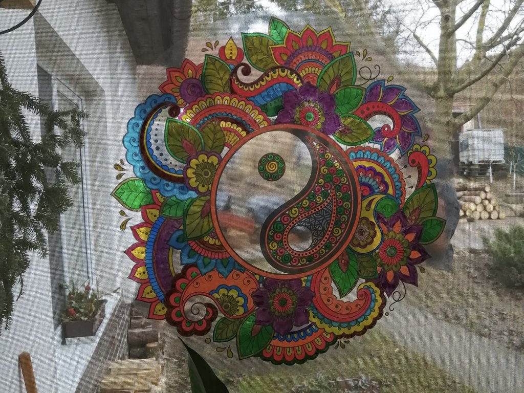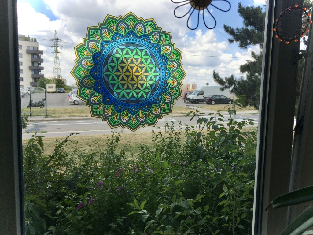 Relaxační omalovánka na okno je vzor určený k vybarvení předtištěný na průhledné fólii.
