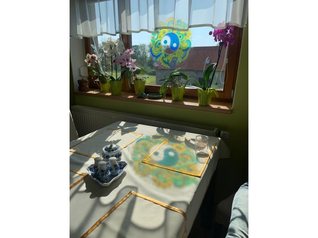 Nejlépe vynikne v okně, do kterého svítí slunce. Barvy a tvary obrázku se díky slunečním paprskům promítají do místnosti, po níž během dne doslova putují a dotvářejí tak její atmosféru.